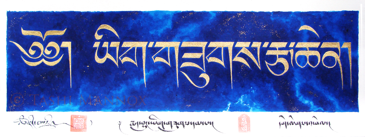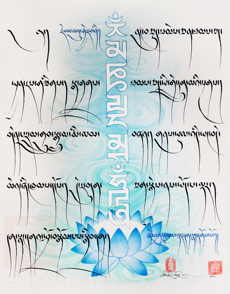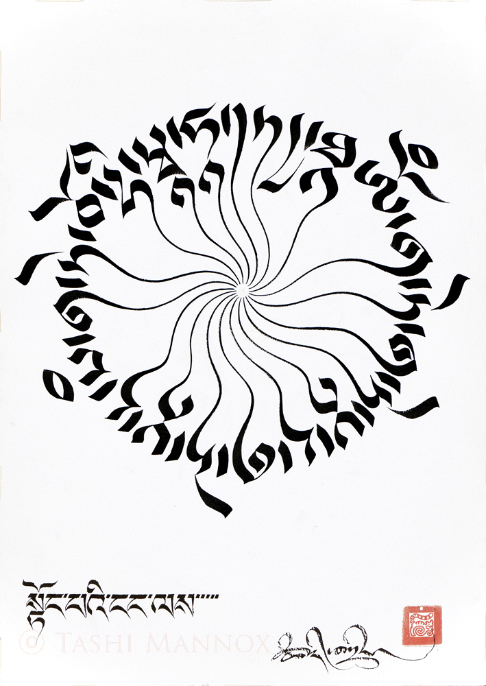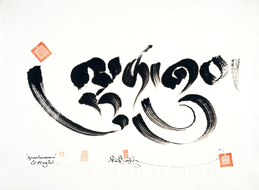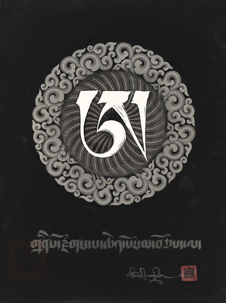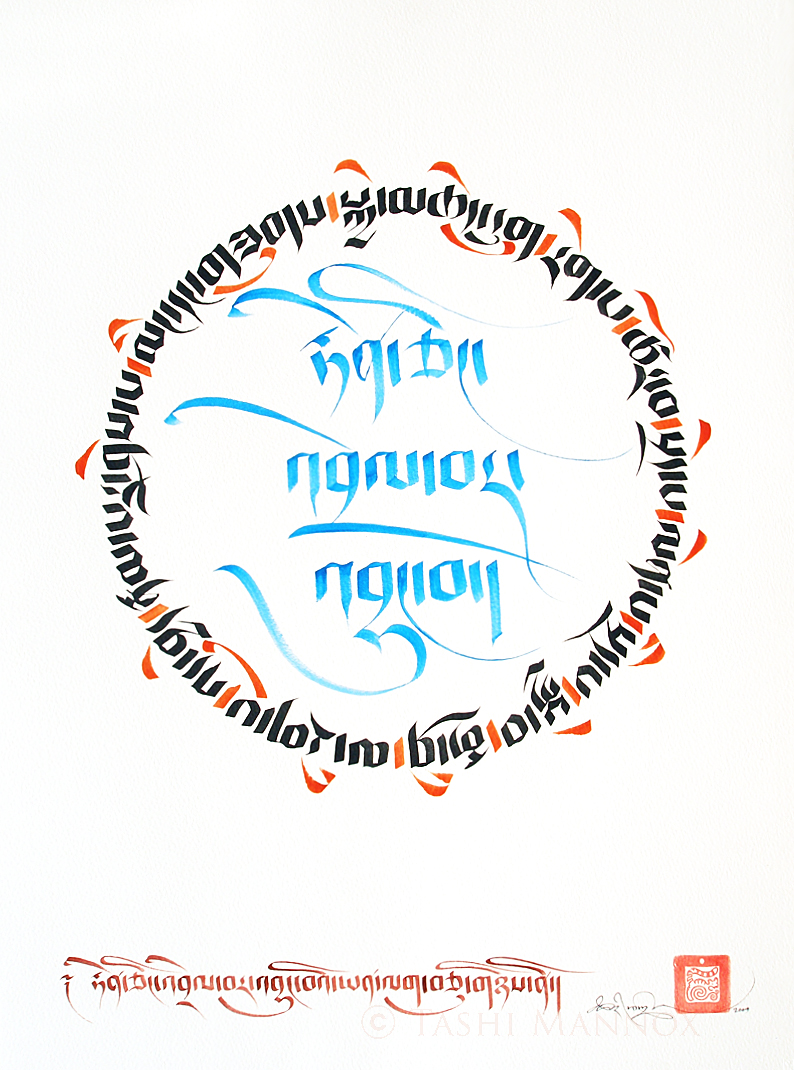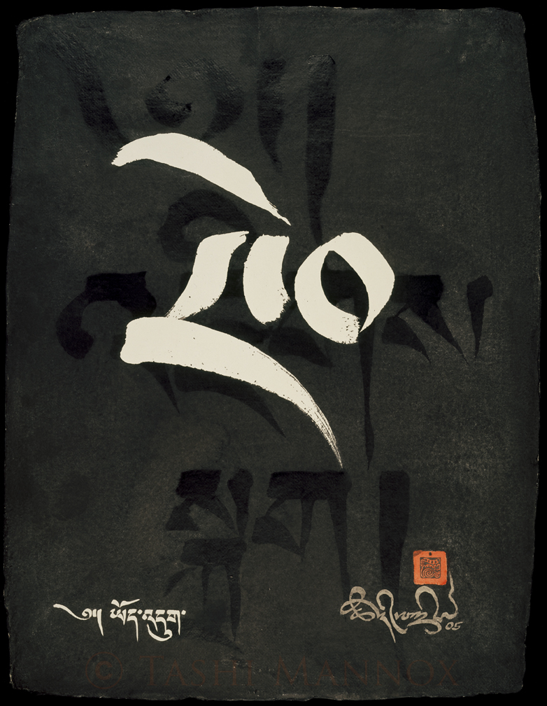 In honoring contemporary contexts and concerns, some of his designs are presented as sacred tattoos. With certain commissioned work he offers the option of including bespoke seals that are specific to the calligraphic project and its patron. In all cases Tashi's art is an expression of his long and devoted meditative practice and spiritual realization, such that his art energetically transmits the Tibetan Buddhist View.