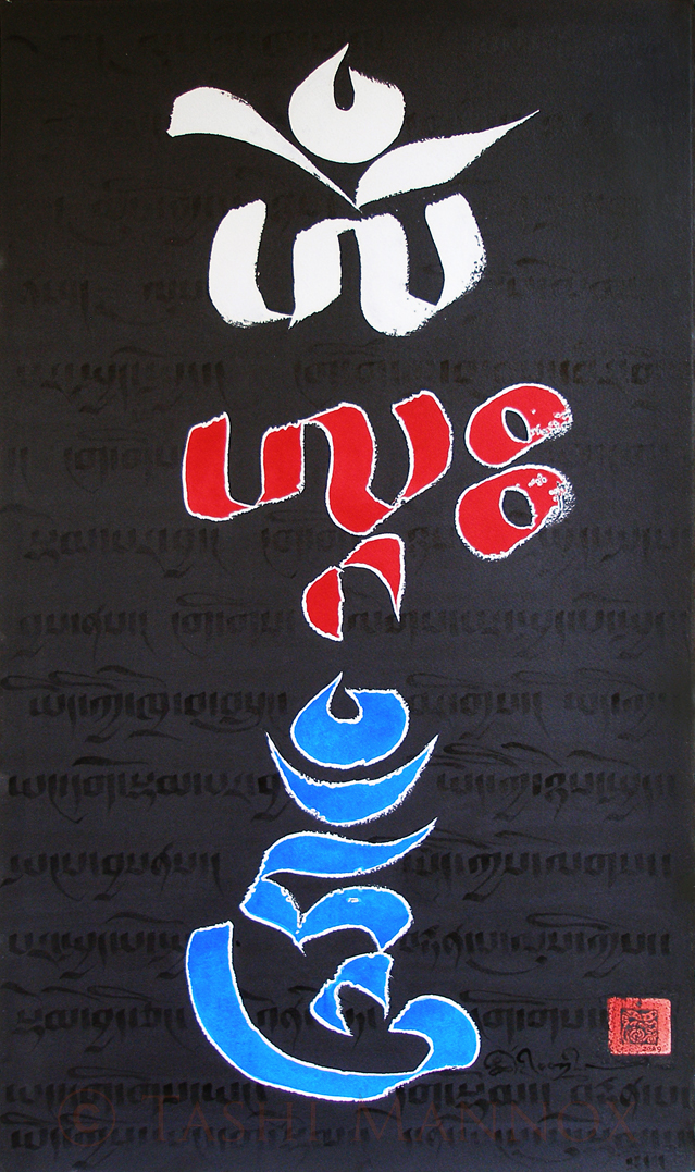 Tashi Mannox, an Englishman, and for many years an ordained Buddhist monk, has trained for decades in the arts of Tibetan calligraphy. Today he preserves this tradition as a vehicle to communicate and transmit dharma, all the while adapting and updating his approach within and for contemporary contexts. He identifies three streams in his work: (1) contemporary and traditional; (2) contemporary black on black, and (3) illuminated iconography.
