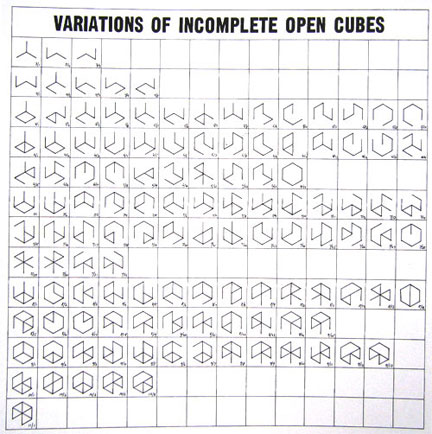 During the complex moment of art making of the 1960s and early 1970s, an era still badly neglected in integral circles concerned with the visual arts, so-called Conceptual currents offered diagrammatic presentations as part of art exhibitions, as with several projects by Sol LeWitt: for example, his diagram of open cubes which were exhibited on occasion with three-dimensional executions of such cubes, the 2D and 3D artifacts constituting in tandem the work of art in those exhibition instances.